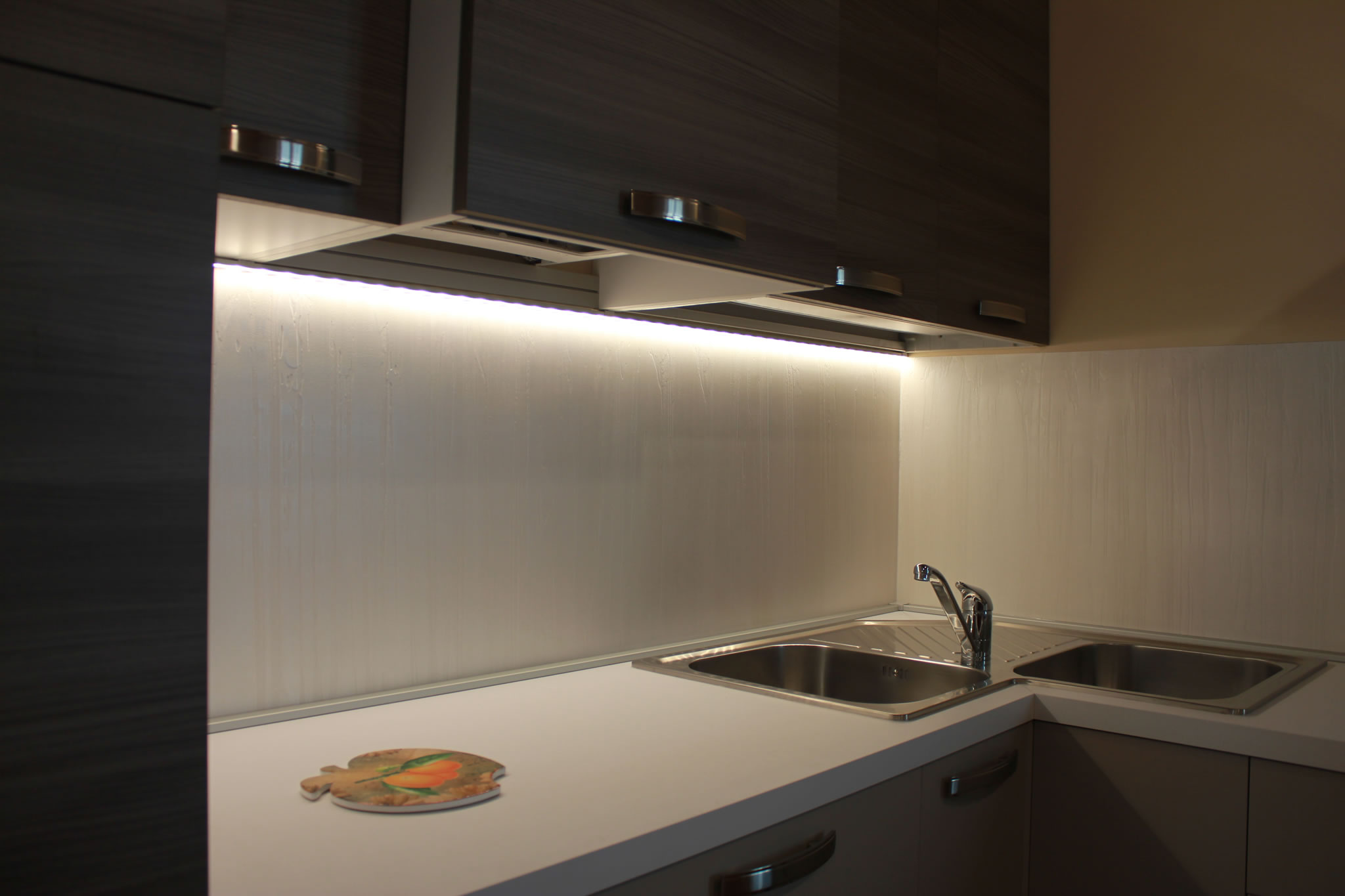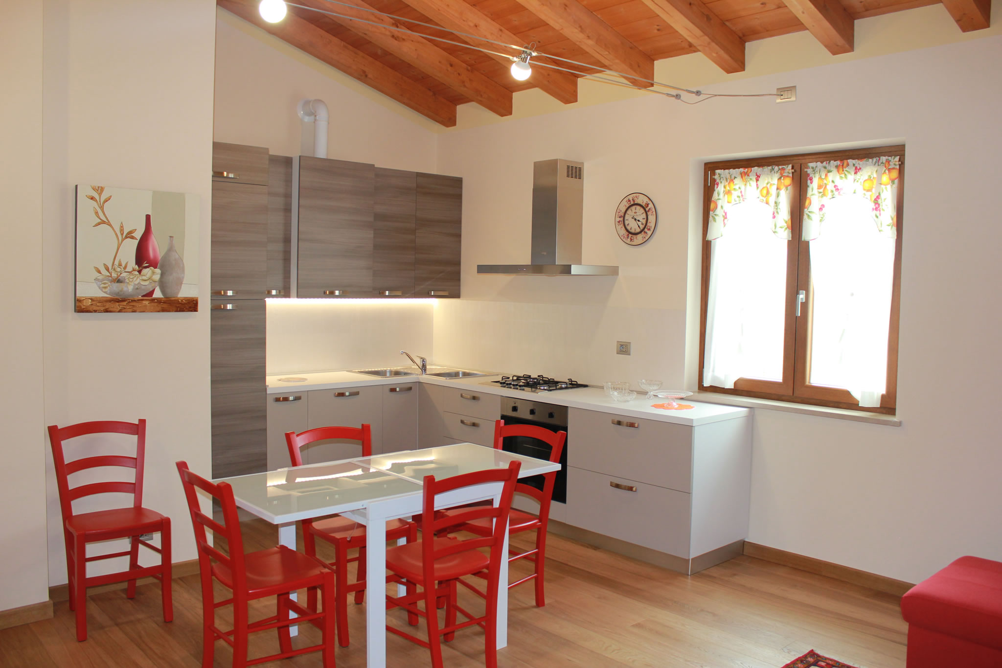 La cucina e il salotto formano un ampio salone d'ingresso con TV satellitare, frigo, divano letto, forno.